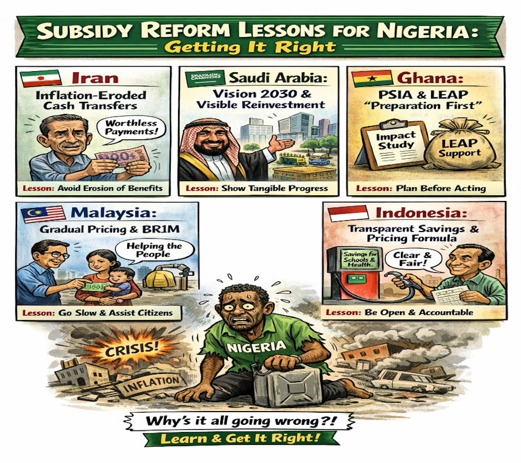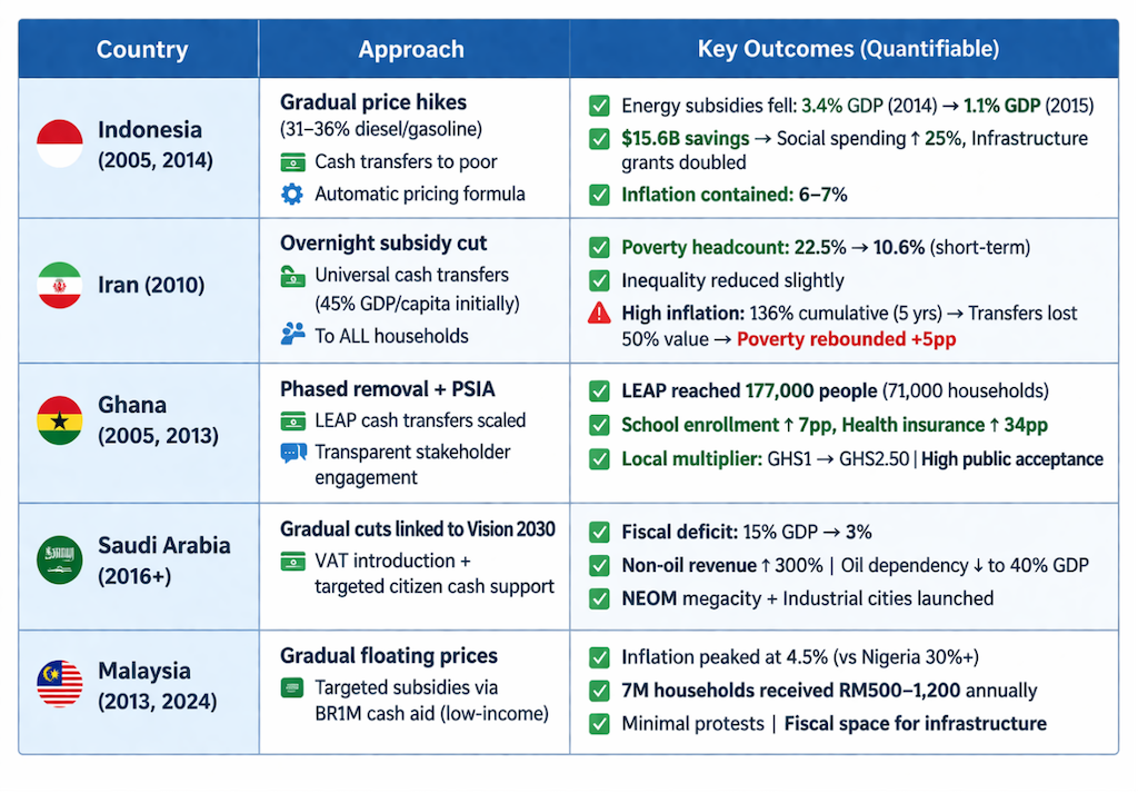 Iran, Saudi Arabia, Ghana, Malaysia, and Indonesia are resource-rich, emerging or middle-income economies that once sustained large subsidies, and faced similar fiscal pressures around energy subsidies like Nigeria.