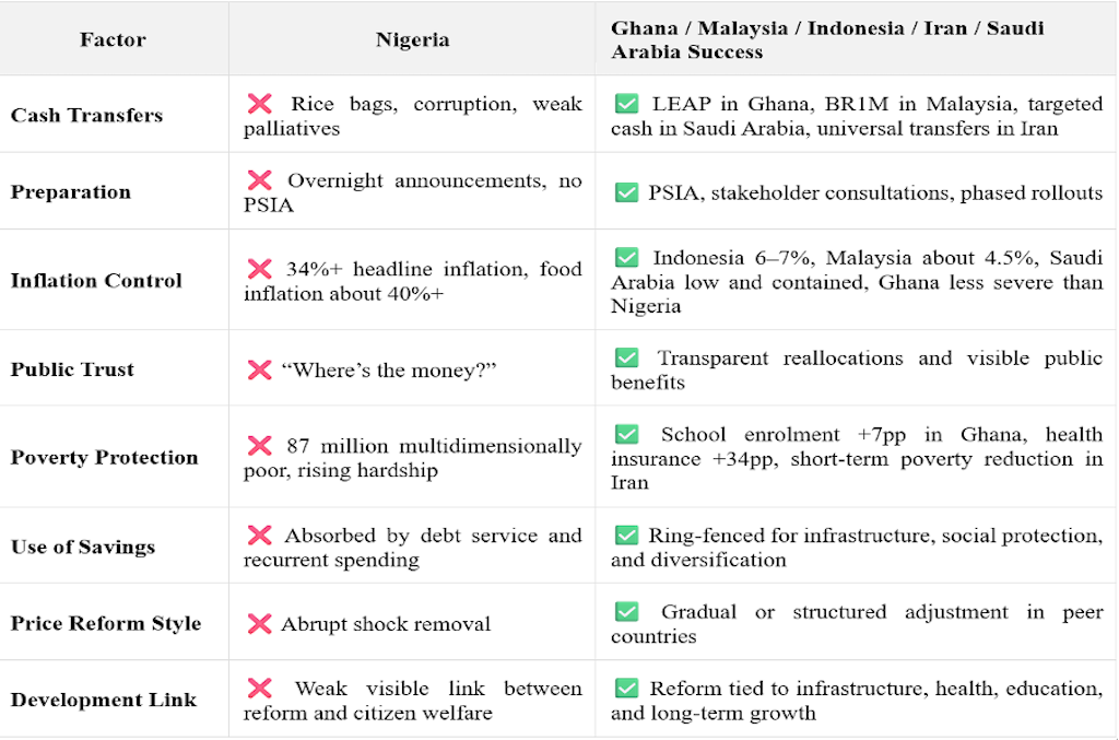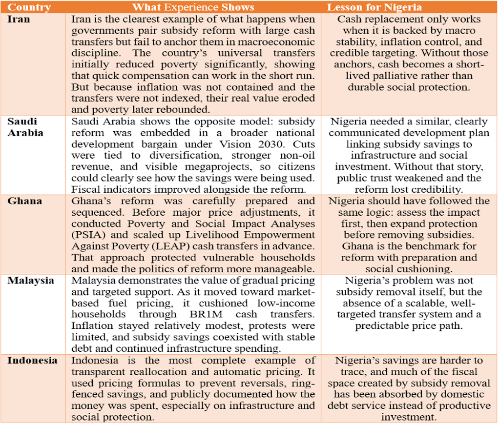 While most peer countries achieved stronger post‑subsidy reform outcomes due to effective preparation, targeted and scalable compensation, and clear reinvestment, Nigeria, by contrast, removed subsidies without an effective roadmap, rather, relying on ad‑hoc palliatives that neither cushioned the shock nor built public trust.